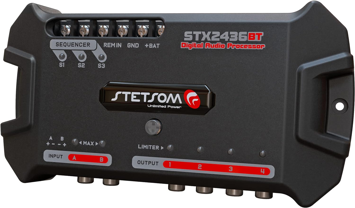 The Stetsom STX2436 is an advanced Bluetooth Automotive Digital Audio Processor, designed to elevate your vehicle’s audio system to professional levels. With cutting-edge digital signal processing (DSP), Bluetooth connectivity, and full control over your system's crossover and equalizer settings, the STX2436 allows you to fine-tune every aspect of your sound. Whether you're an audio enthusiast or a professional installer, the STX2436 delivers unmatched clarity, performance, and convenience for your car audio setup.